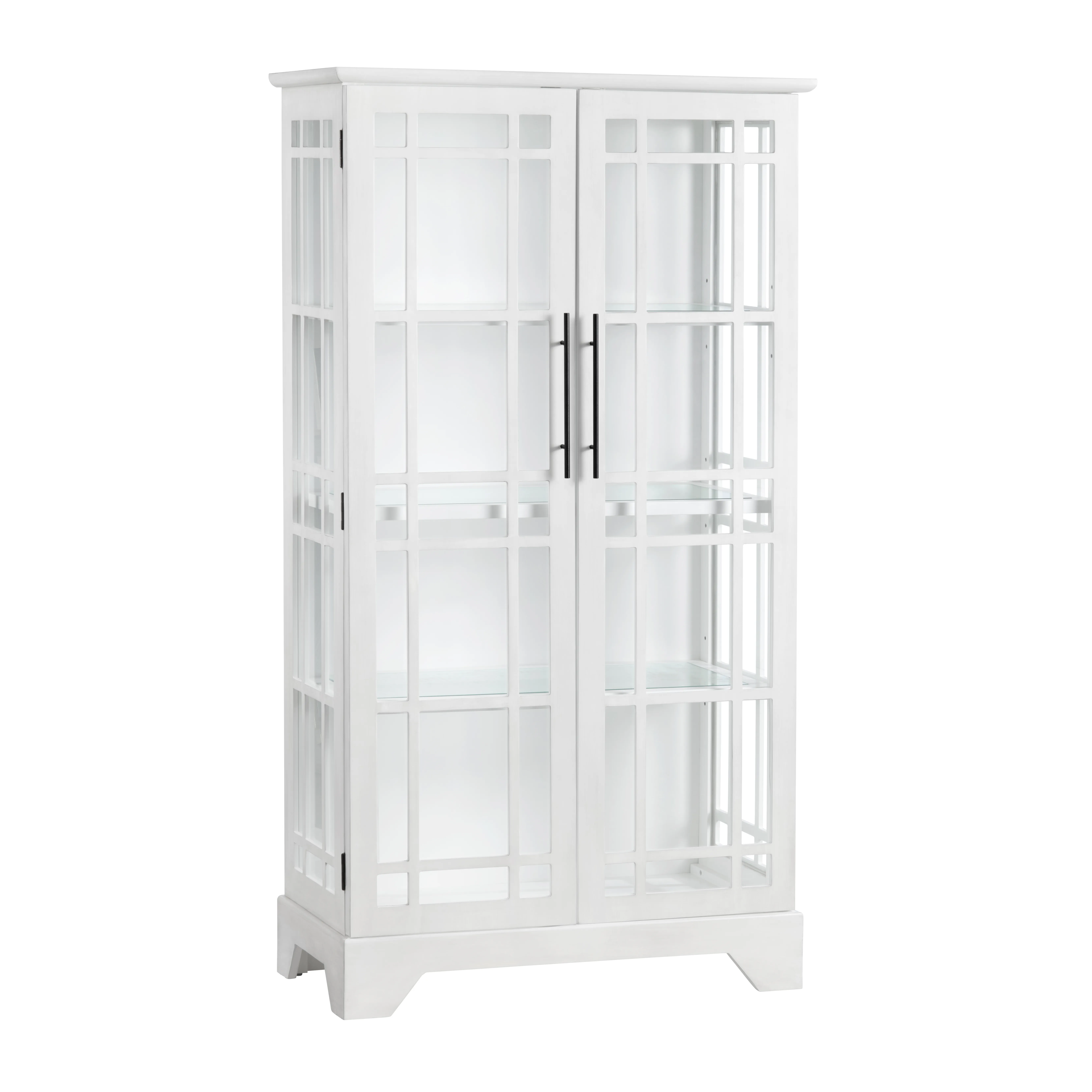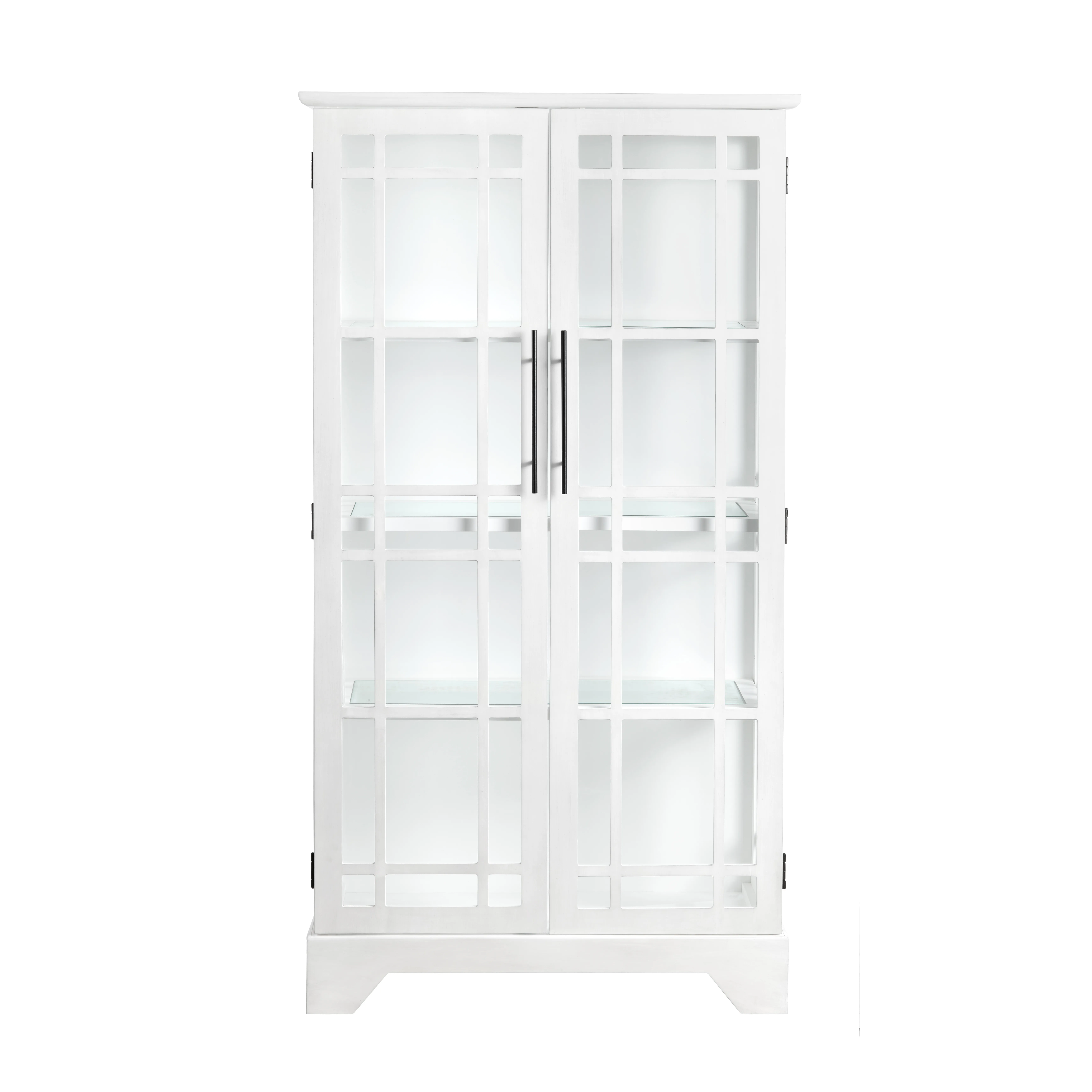 Elevate your space with this striking white display cabinet, blending clean lines with an airy, open feel. Crafted from wood, its rectangular silhouette is accentuated by geometric glass-paneled doors, framed by bold black handles for a modern touch. Inside, three fixed shelves—crafted from a combination of wood and glass—offer ample storage for displaying decor, books, or collectibles. Just set up and enjoy a sleek yet functional statement piece