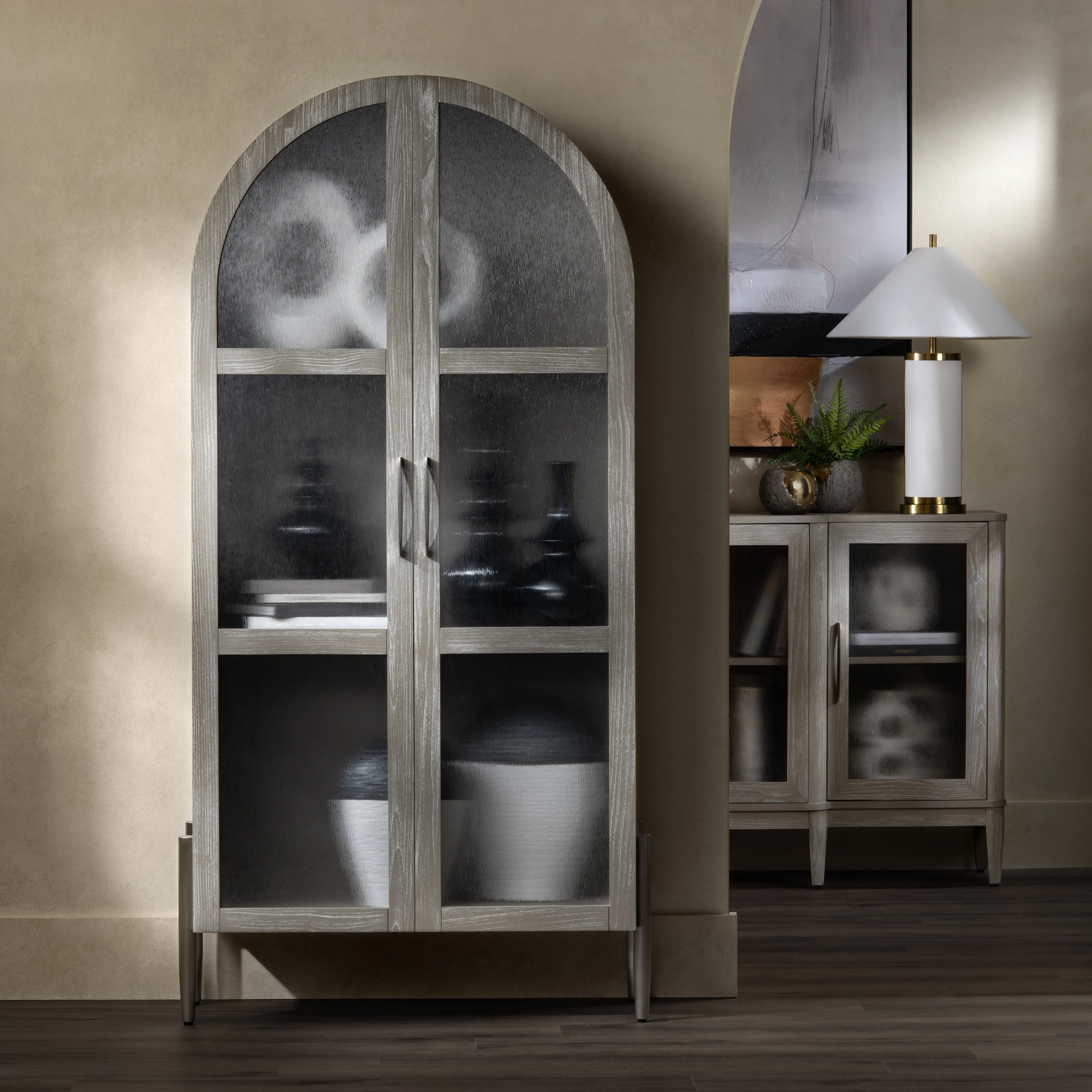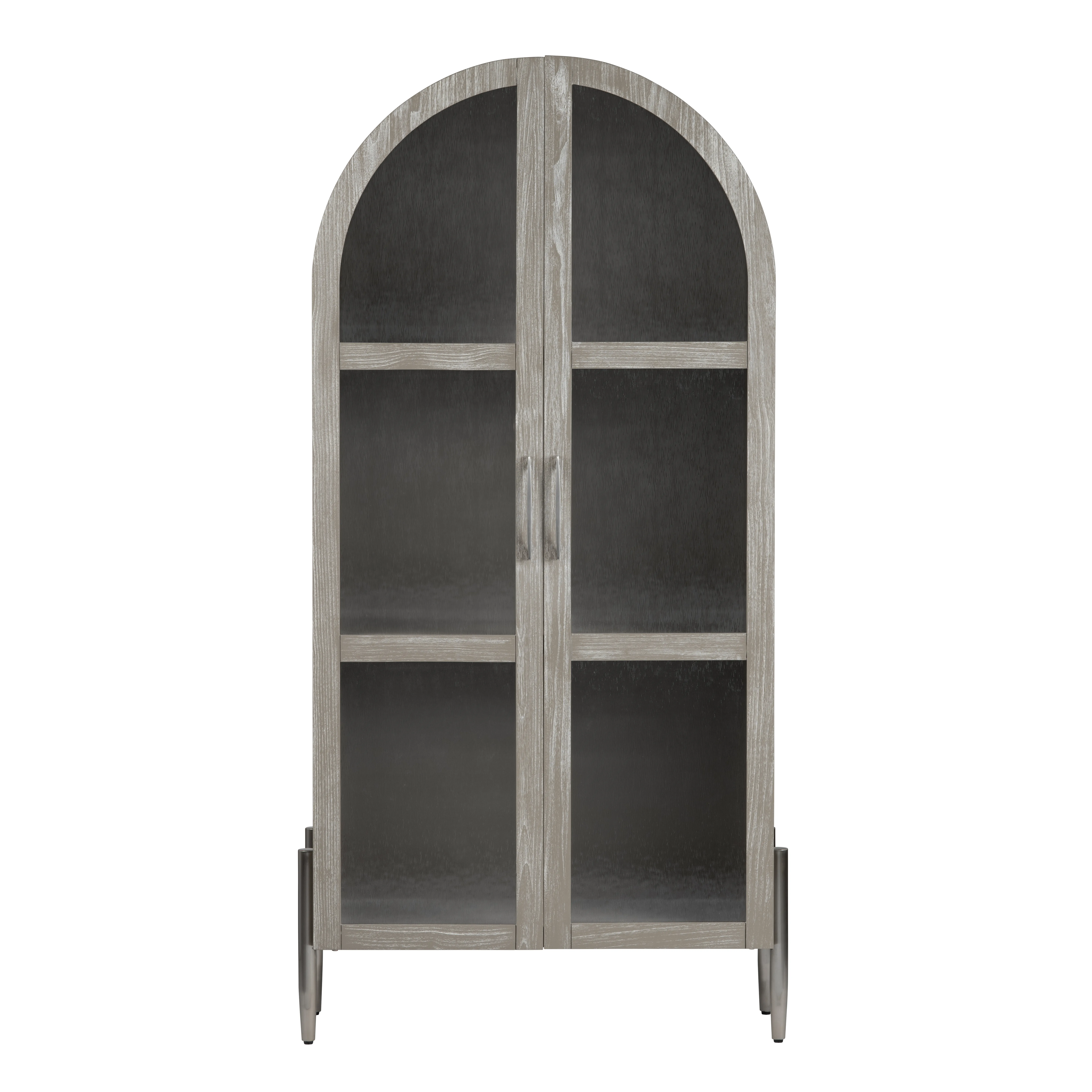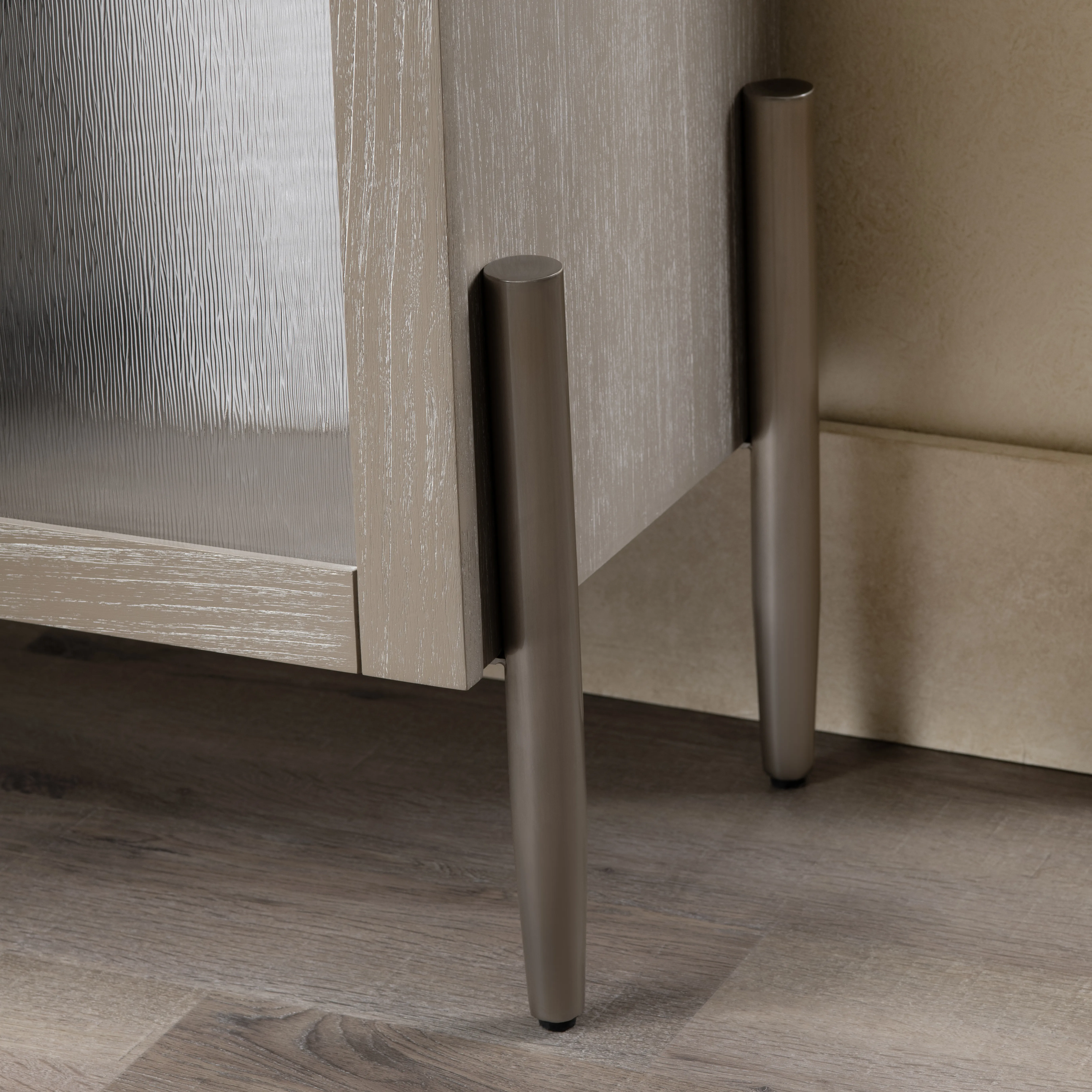 This sleek cabinet blends modern functionality with elegant design. Crafted from rubberwood and white oak veneer, it boasts a khaki finish with subtle brown undertones for a natural, sophisticated look. Featuring two tempered glass doors with soft-close European hinges and metal silver handles, the cabinet provides easy access to two fixed shelves for organized storage. Supported by sturdy steel legs with floor levelers, its contemporary design is complete with effortless assembly—just add the feet