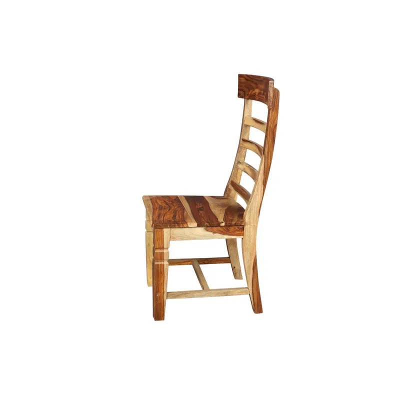 A beautiful Tahoe curved back dining height chair with a slat back made from solid wood. Handmade in India by artisans this one-of-kind piece showcases the beautiful natural wood grain of sheesham wood.