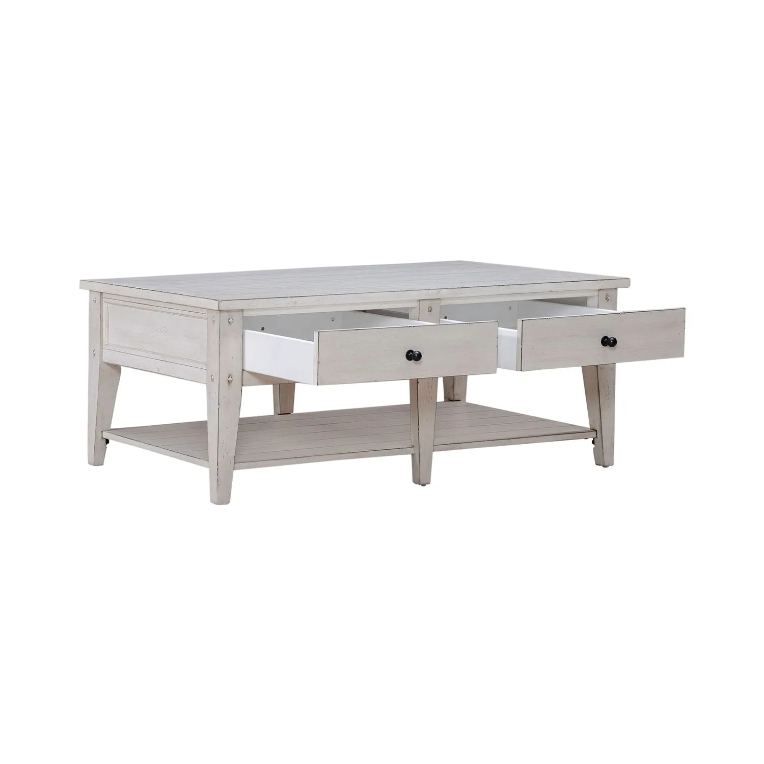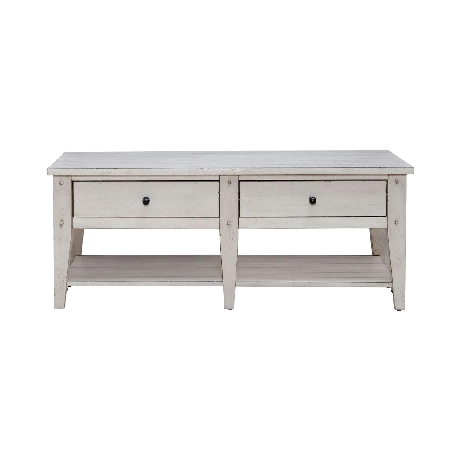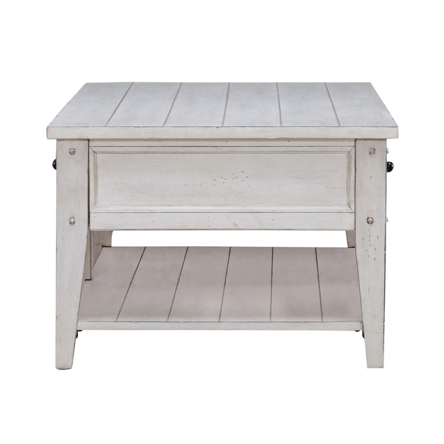 Lake House Occasional made of Select hardwoods & Oak Veneers with Multi-Step Hand Applied Oak Finish. Appealing Planked Tops & Tapered Legs with Veneered Shelves. The Drawers feature Wood-on-Wood Drawer Glides with Wood-on-Wood Drawer Glides