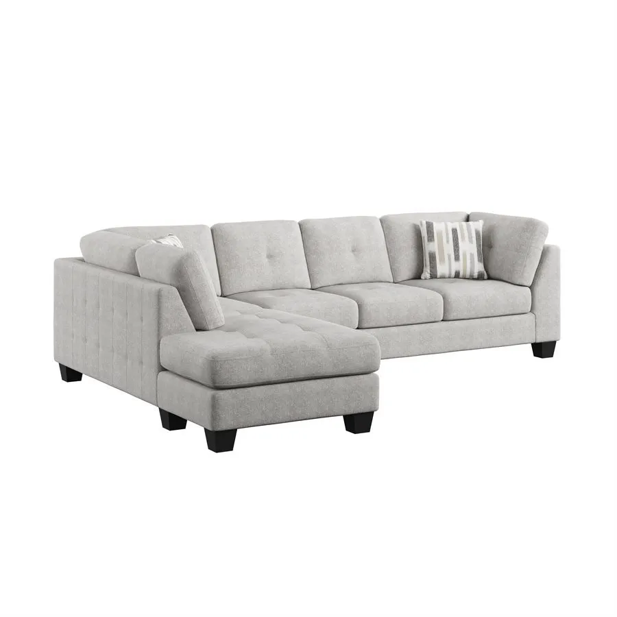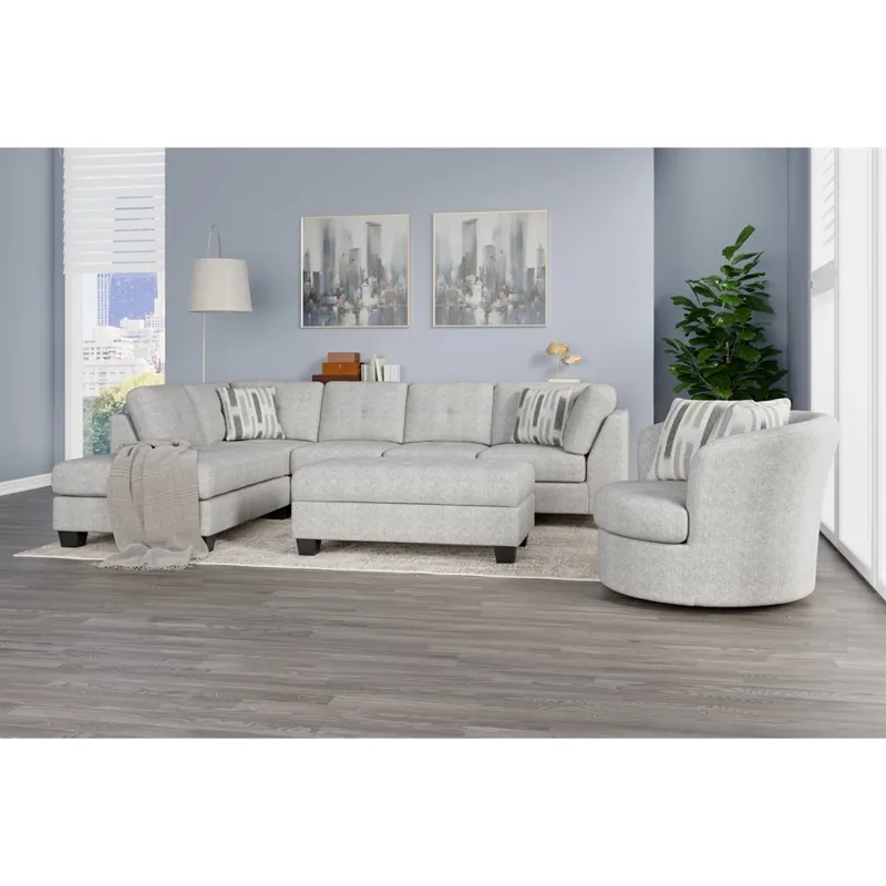 - The Myles collection brings a sense of relaxed sophistication to your space. The chaise sectional, featuring contemporary tufting on both cushions and frame and sturdy solid wood legs, strikes a balance between modern design and lasting comfort. A storage cocktail ottoman keeps essentials close at hand yet out of sight. A roomy swivel chair invites you to sink in and unwind, offering a cozy spot to relax or enjoy conversation. Upholstered in light gray chenille with a faint patterned texture, the Myles collection is designed for spaces where style meets everyday living.