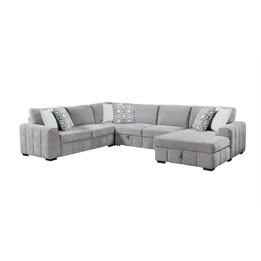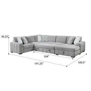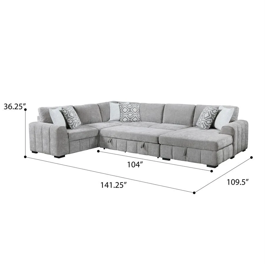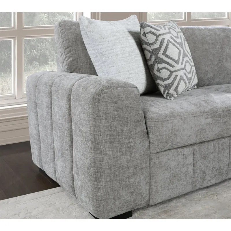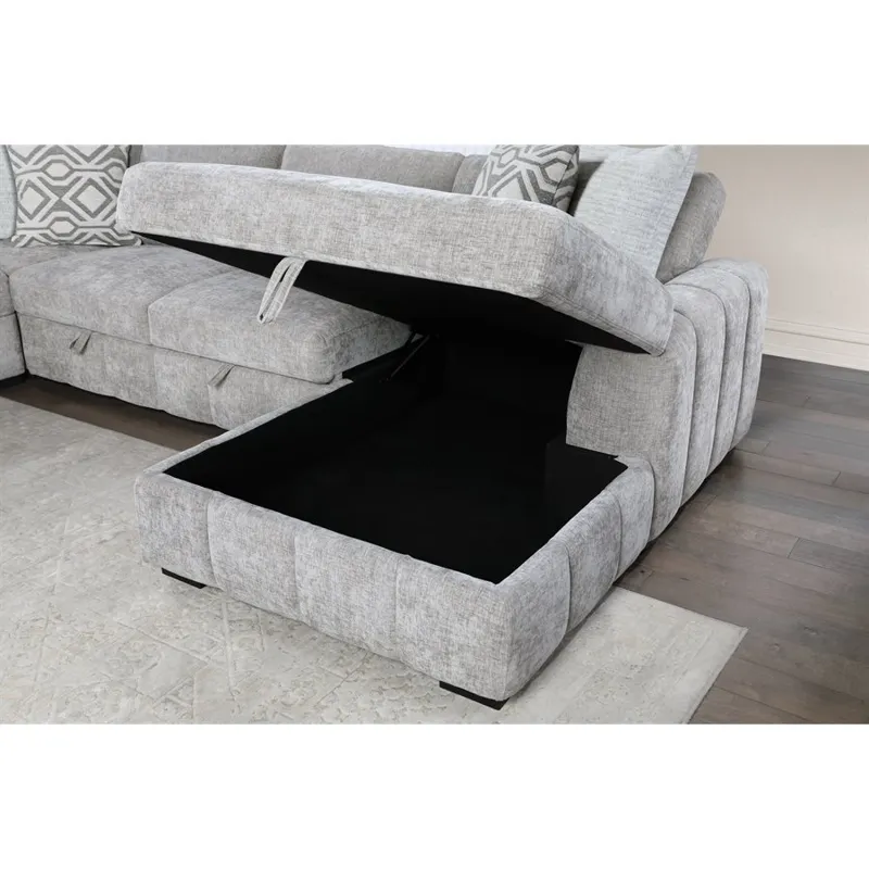 The Ritchie Collection invites you to sit but beckons you to stay. As you settle in, you'll notice all the contemporary details—fixed cushions that cradle you, a spacious chaise that begs for lazy afternoons, and a pop-up sleeper for those impromptu guest visits. The large accent chair, with a 360-degree swivel, amplifies the cozy seating options while draped in luxuriously soft white faux fur. The sectional is upholstered in a soft, light gray fabric, with vertical channel tufting on the sides, front, and ottoman, while the brown and creamy white patterned and faux fur throw pillows add depth and warmth. With hidden storage in the chaise and ottoman, everything you need is always within reach. Â