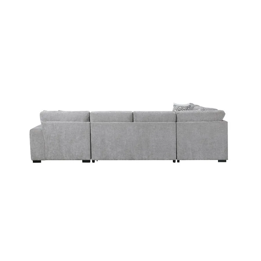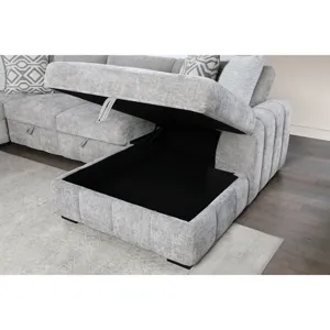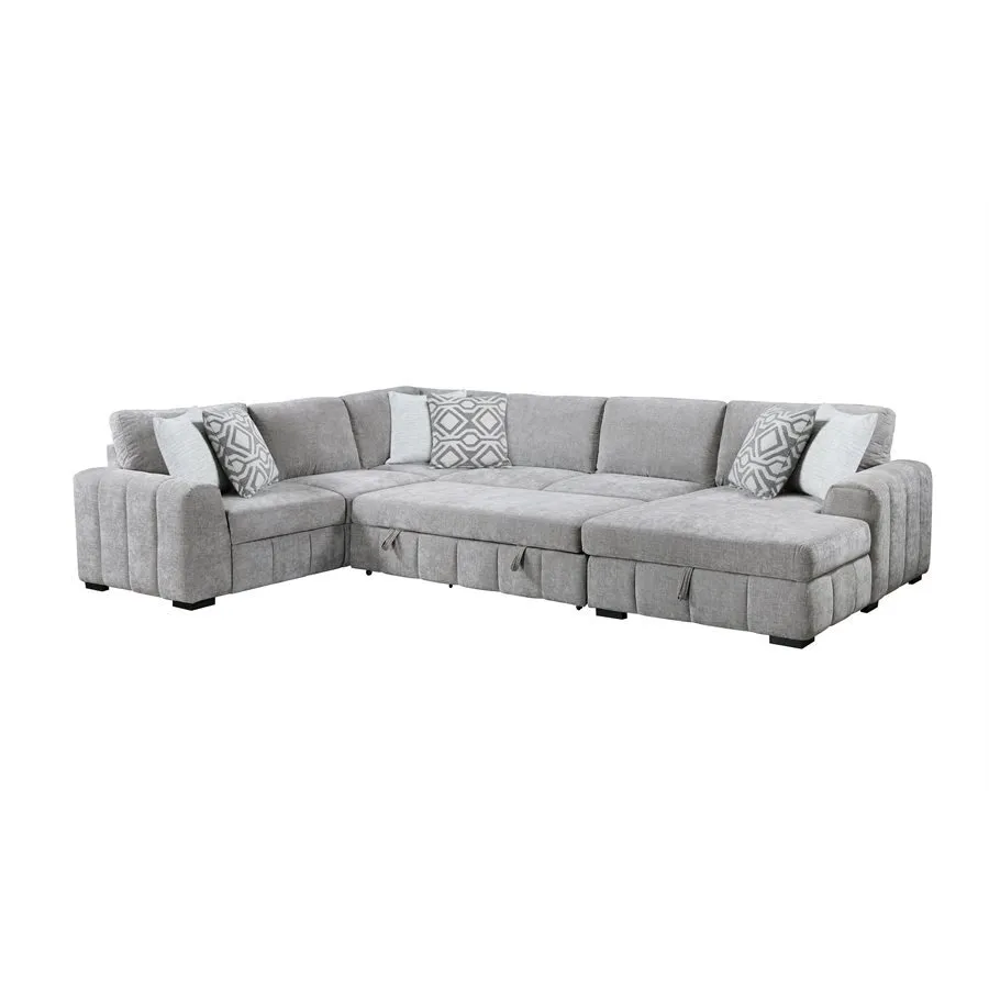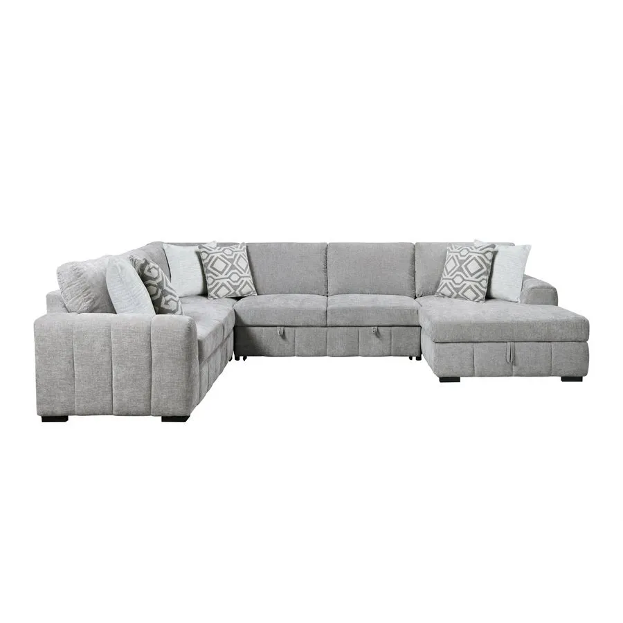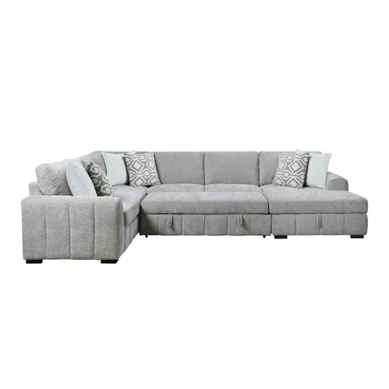 The Ritchie Collection invites you to sit but beckons you to stay. As you settle in, you'll notice all the contemporary details—fixed cushions that cradle you, a spacious chaise that begs for lazy afternoons, and a pop-up sleeper for those impromptu guest visits. The large accent chair, with a 360-degree swivel, amplifies the cozy seating options while draped in luxuriously soft white faux fur. The sectional is upholstered in a soft, light gray fabric, with vertical channel tufting on the sides, front, and ottoman, while the brown and creamy white patterned and faux fur throw pillows add depth and warmth. With hidden storage in the chaise and ottoman, everything you need is always within reach. Â