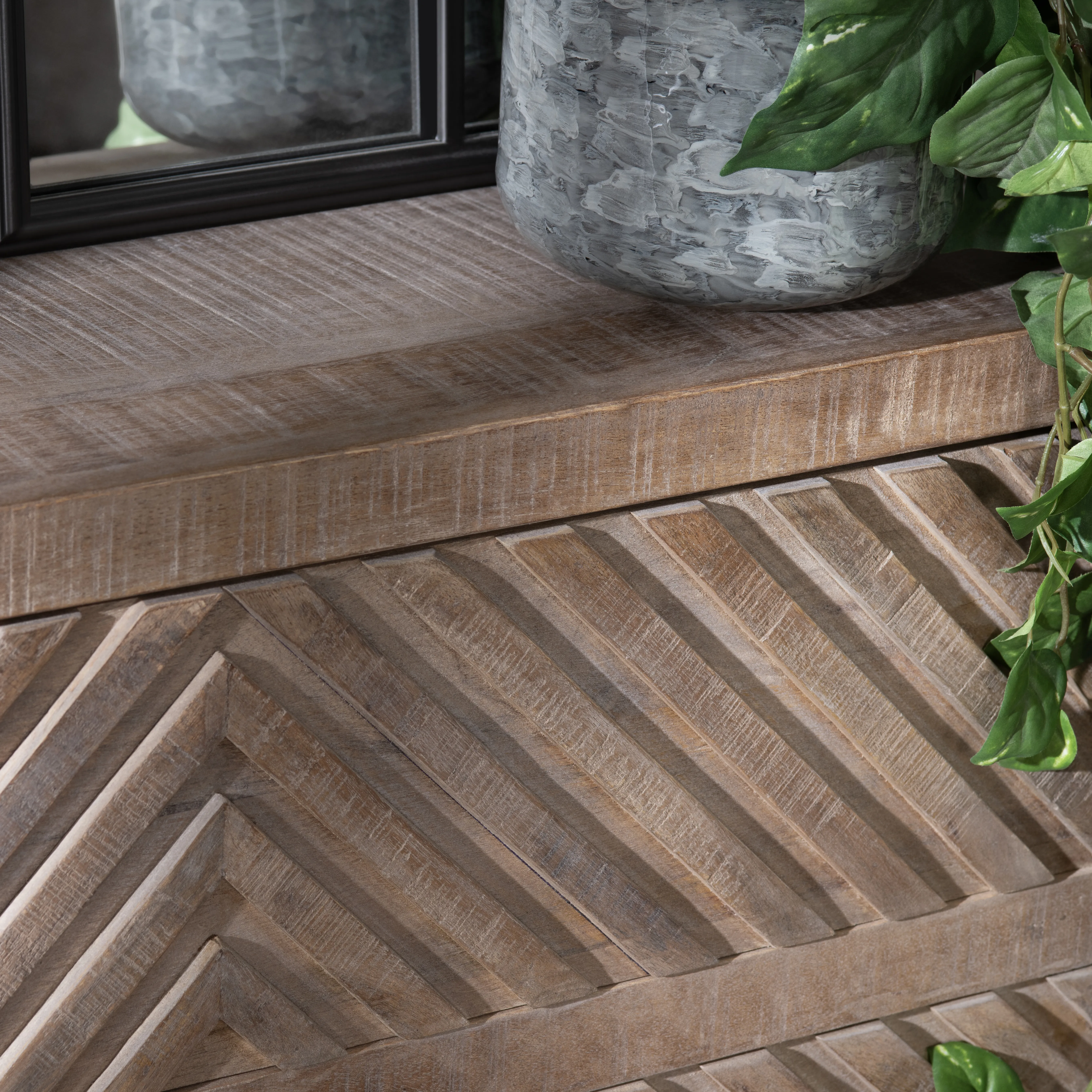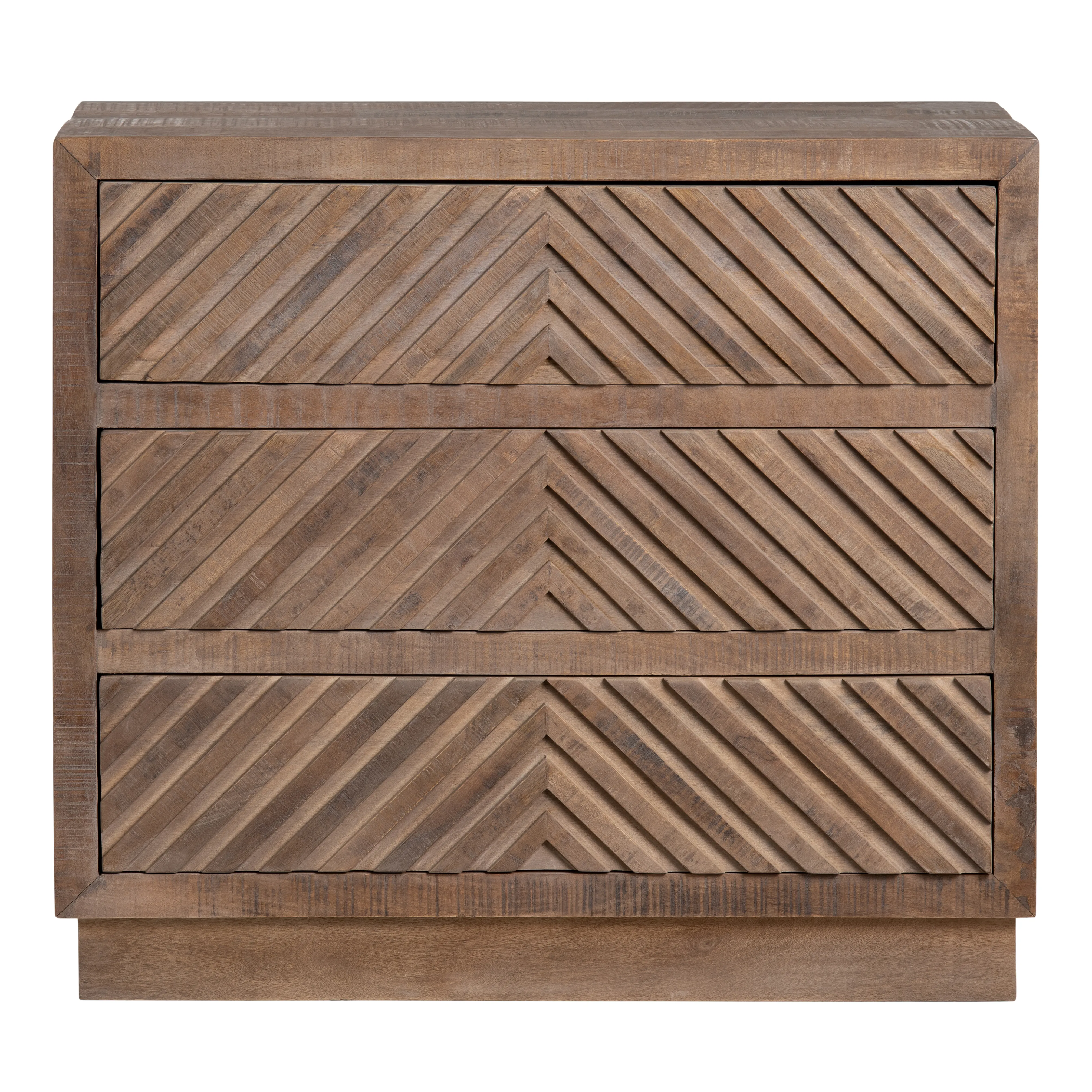 Crafted from mango wood with a warm brown stained finish, this chest showcases a striking geometric design with meticulously carved chevron patterns on each of its three drawers. The rectangular shape is complemented by a sturdy base, subtly elevating the piece. Wood glides ensure smooth drawer operation, while floor levelers provide stability on various surfaces. Just set up, this chest blends bold textures with natural wood tones, making it a statement storage piece for any space