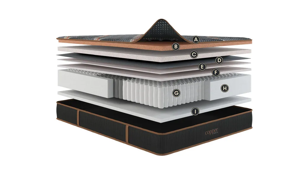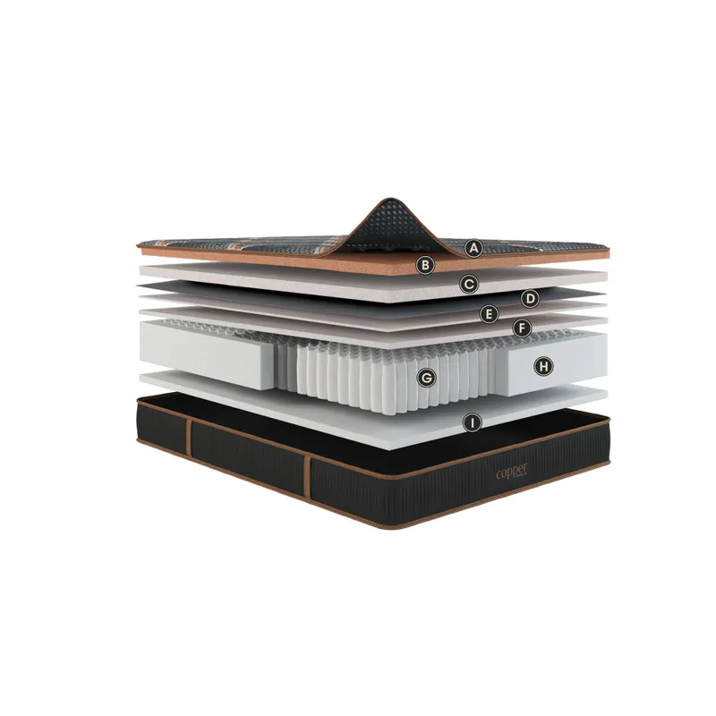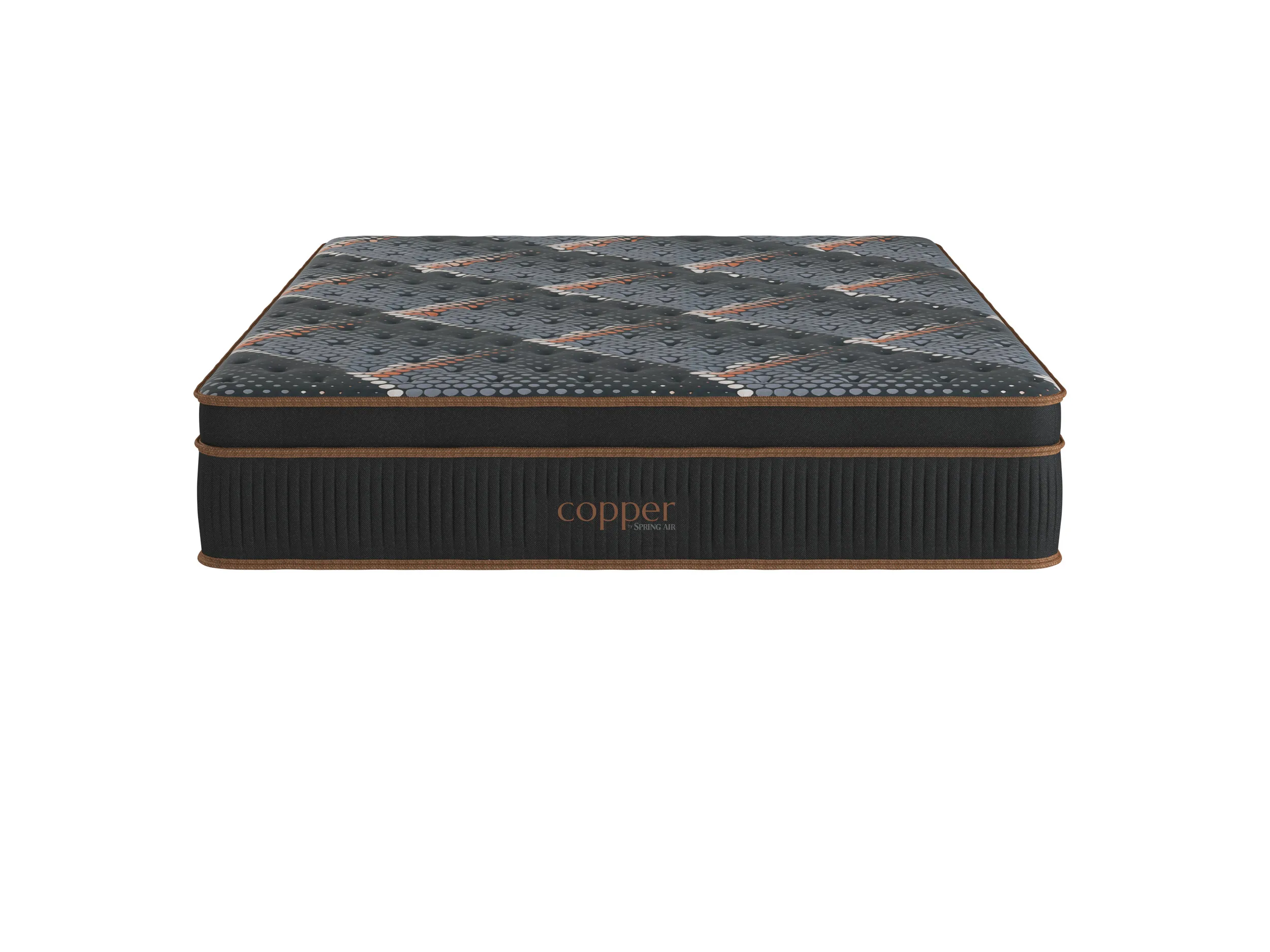 The Copper by Spring Air Hybrid Quilted models provide wellness while you sleep in a choice of Firm, Medium, and Eurotop Plush comfort options. Hyper-soft copper infused memory foams complement the responsive 3-Zone 875 Encased Coil Unit with high-density perimeter foam encasement. This hybrid design is paired with our patented Natuverex™ Copper-Infused cover elevating your sleep and enhancing your health.
